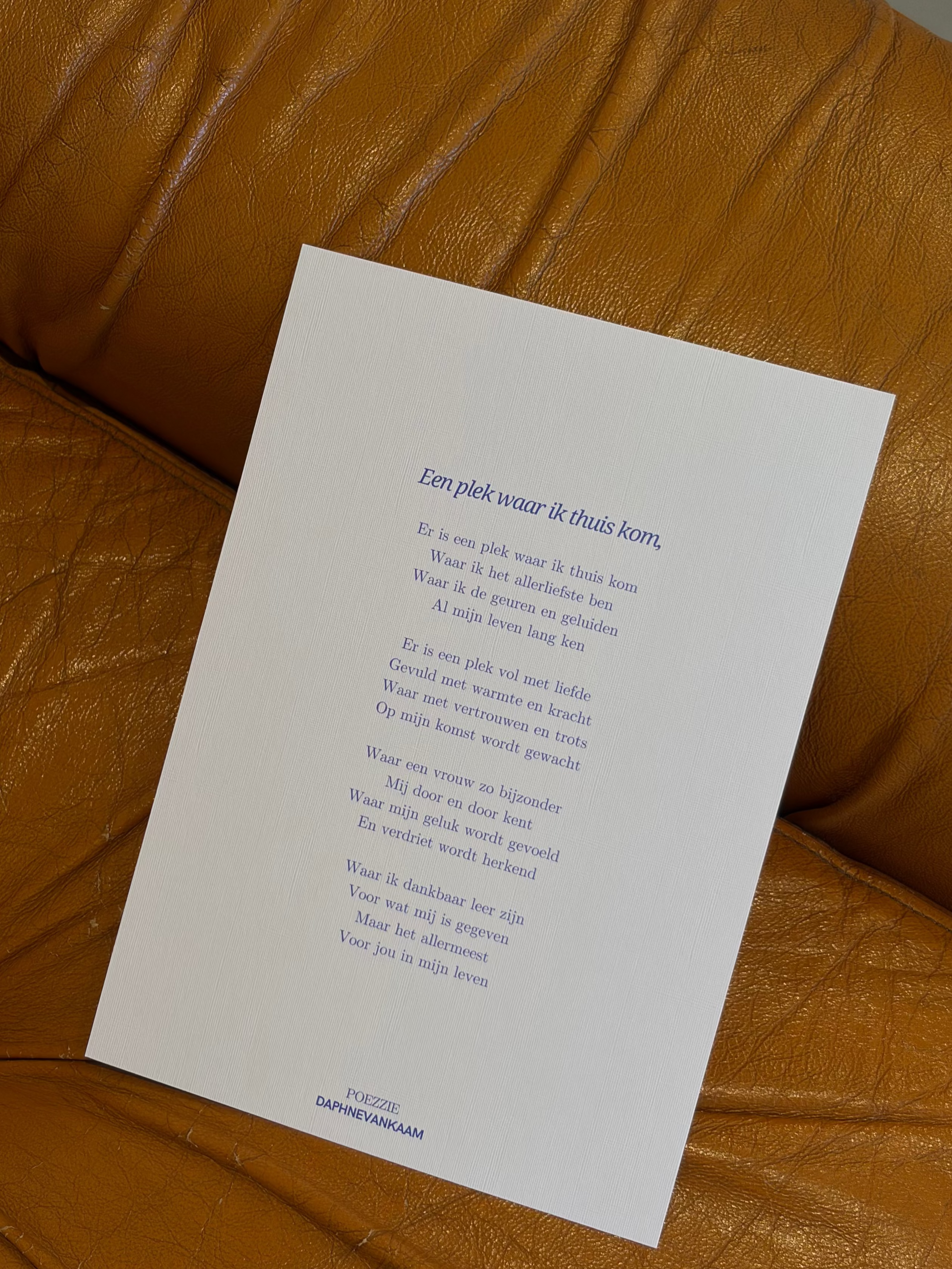 Een gedichtje over een plek waar je je thuisvoelt. Voor een opa, oma of iemand anders die jou terugbrengt naar vroeger. Gedrukt op A5 en luxe linnenpapier. Een cadeautje voor jezelf of een ander.